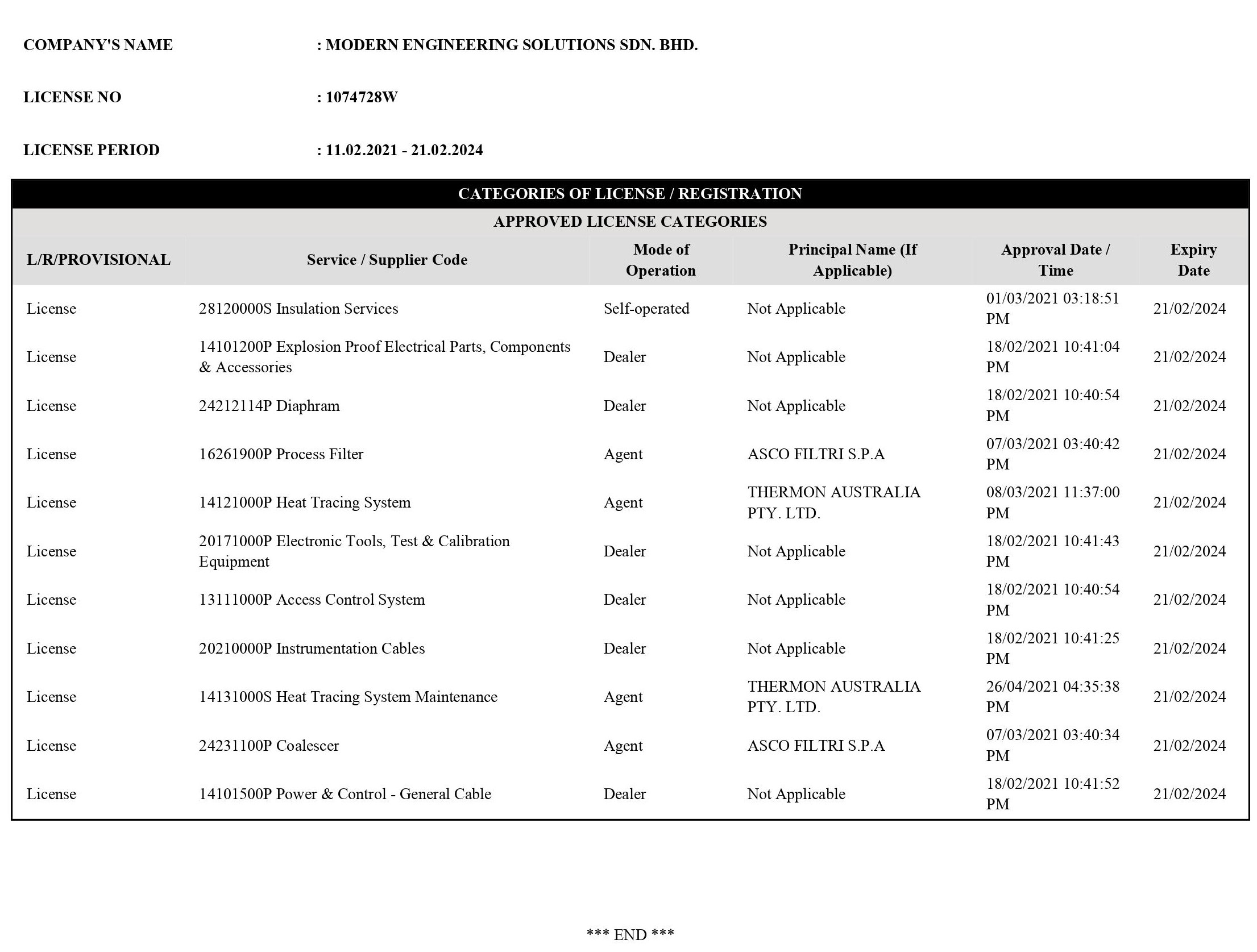 License to supply product/service to exploration and oil/gas companies in Malaysia. (click to view)